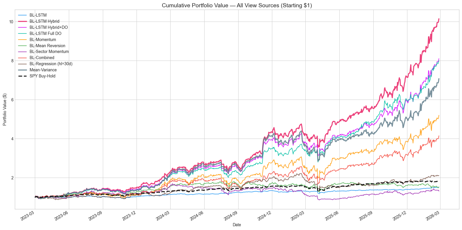 - A hybrid blending strategy that selectively combines high-confidence LSTM views with mean-variance fallback weights, achieving a Sharpe ratio of 2.54 over 3 years.