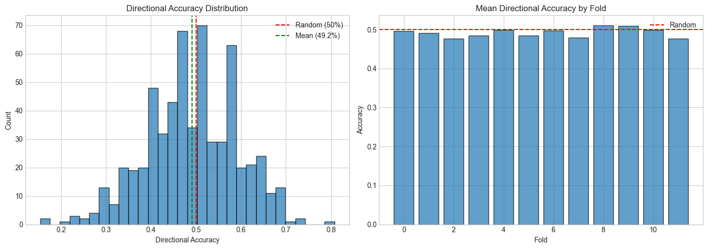 Figure 1: Distribution of LSTM directional accuracy across 6,396 models (533 stocks x 12 folds). The distribution is centered near 50% (random baseline), with a right tail of genuinely predictive models.