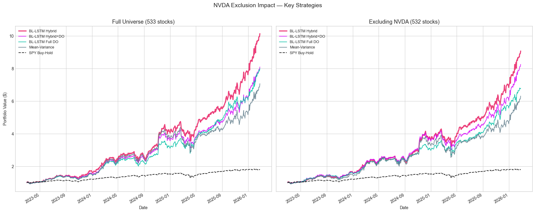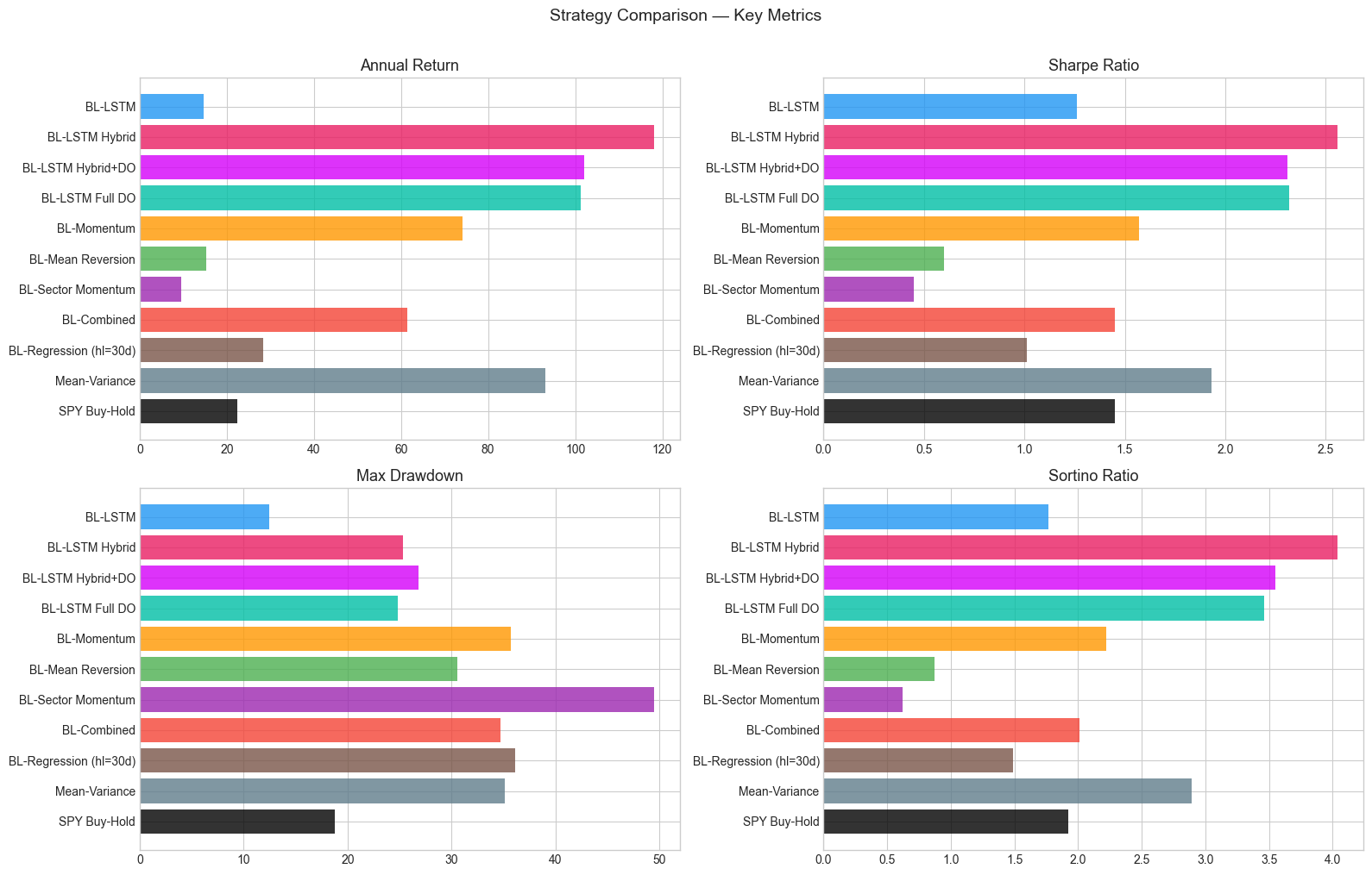 The BL-LSTM Hybrid strategy achieves a Sharpe ratio of 2.54 (vs. 1.45 for SPY) with a maximum drawdown of 25.3%. This outperformance survives the Deflated Sharpe Ratio correction for multiple testing (DSR = 97.0% against SPY at the default parameters), is consistent across all three yearly sub-periods, and maintains its bootstrap 90% confidence interval entirely above SPY's Sharpe.
