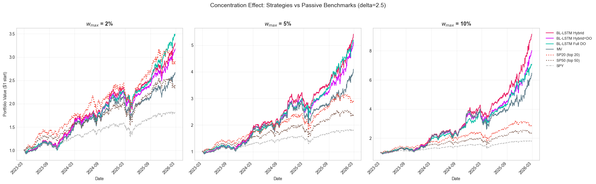 At no concentration level does the LSTM Hybrid strategy fail to beat its passive equivalent over the full period. But the margin narrows from overwhelming (+1.04 Sharpe vs SP50 at 10%) to modest (+0.53 at 2%), the temporal consistency degrades substantially, and the MV baseline nearly loses its edge over passive at the highest diversification levels. This underscores that the LSTM's contribution is primarily an intensive-margin effect --- improving the weight allocated to the best opportunities --- rather than an extensive-margin effect of finding alpha across the full universe.