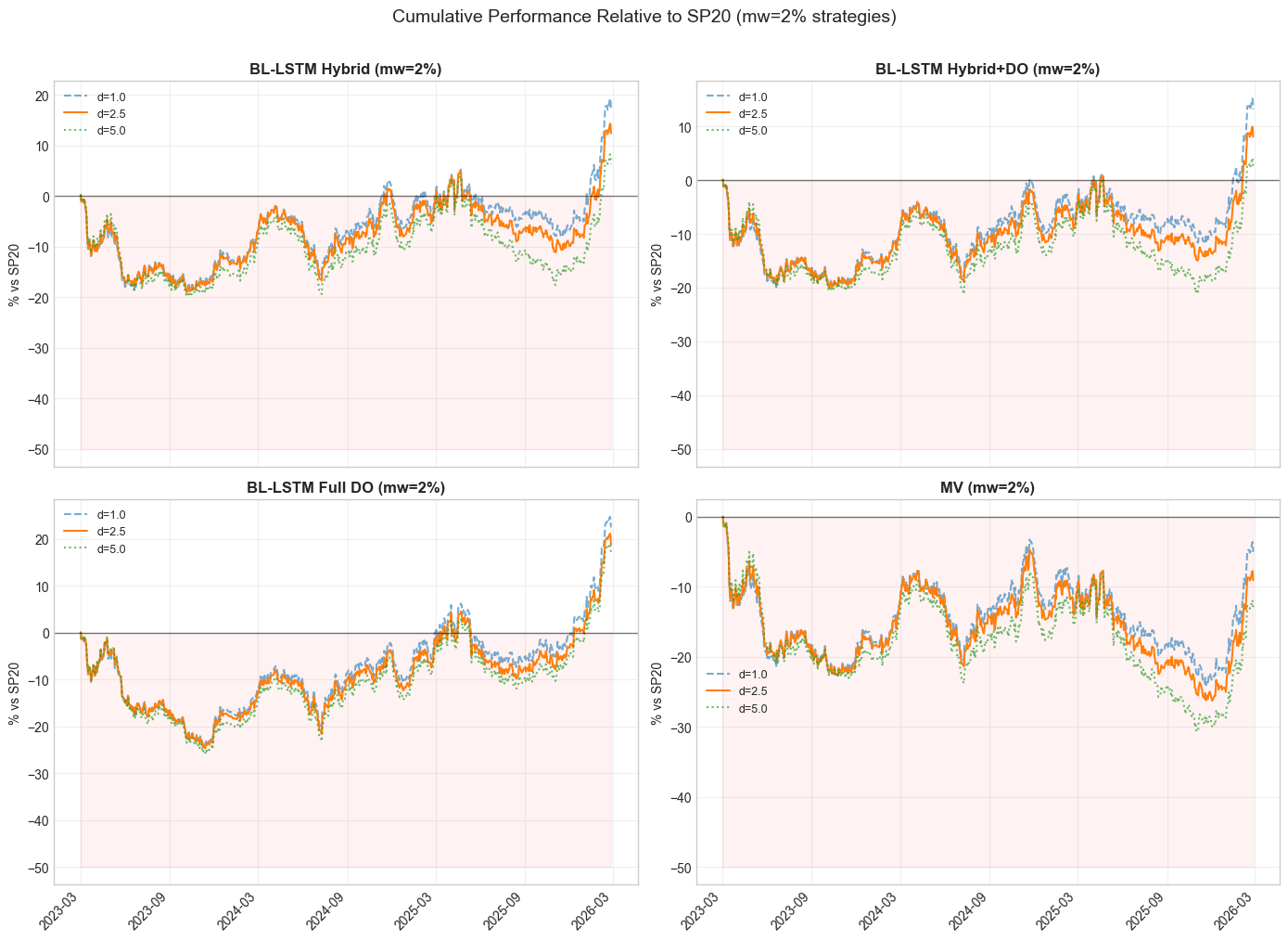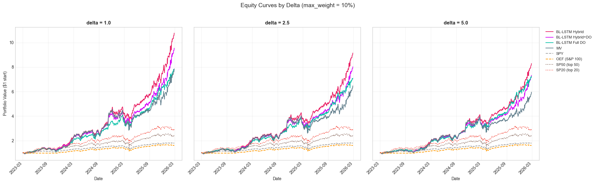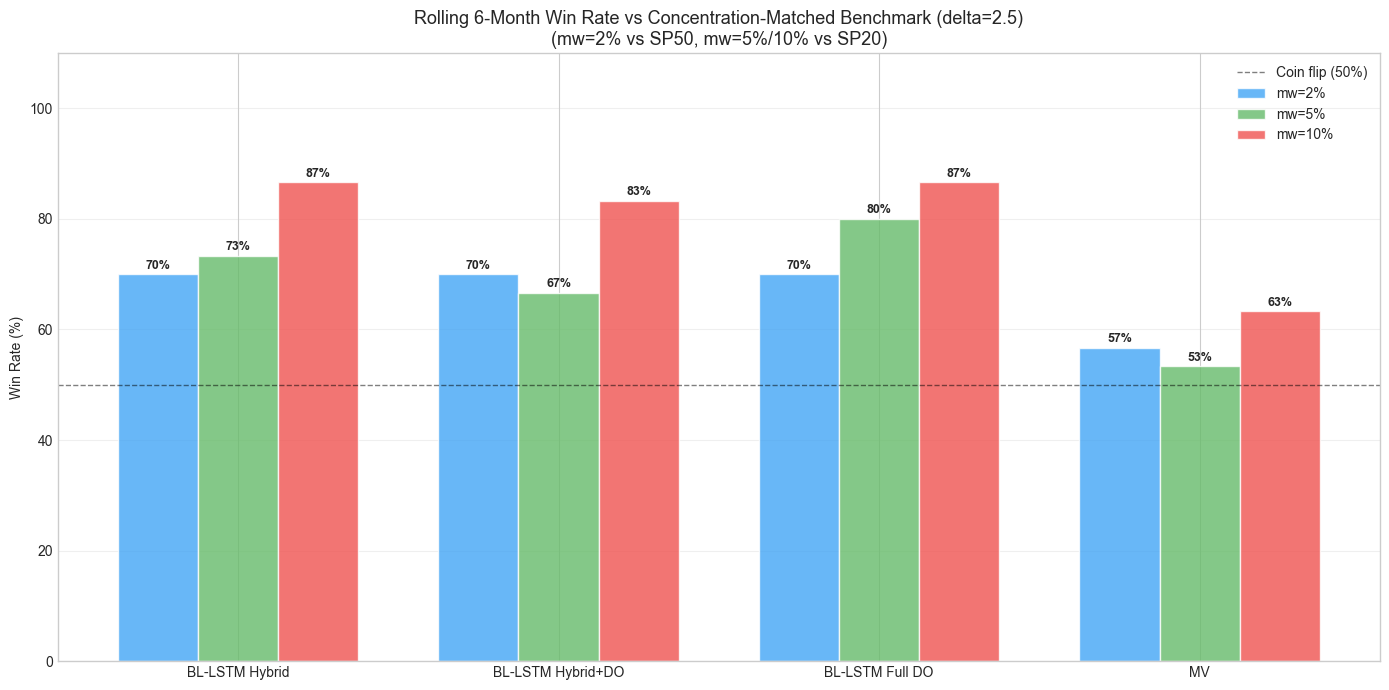 At , all four strategies beat SP20 in 80--100% of rolling 6-month windows. At , MV's win rate against SP50 drops to 43--57% --- essentially a coin flip. Even the LSTM strategies drop to 50--70% win rates against SP20 at , depending on delta. The temporal consistency that makes the concentrated strategies compelling investments (you almost always beat the benchmark over any 6-month window) evaporates at high diversification levels.