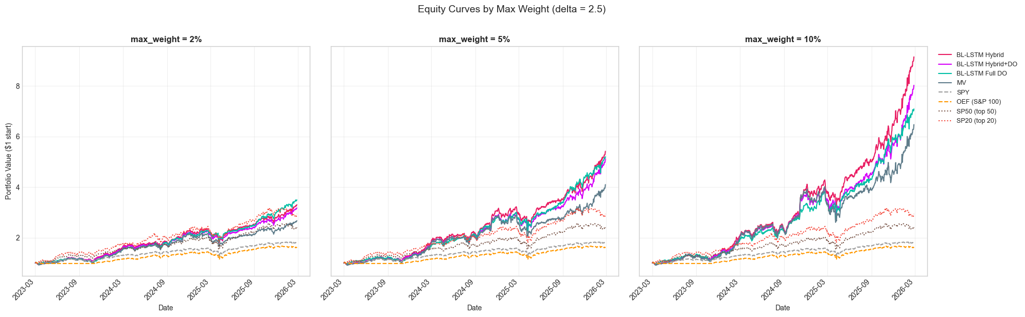 The passive cap-weighted benchmarks (SP20, SP50) have Sharpe/Beta ratios near 1.0, indicating they offer no alpha beyond leveraged market exposure. All LSTM strategies maintain Sharpe/Beta substantially above 1.0 at every diversification level, confirming genuine alpha generation. However, this ratio drops from ~1.8 at 5--10% max weight to ~1.56 at 2% --- the signal dilution is quantifiable.