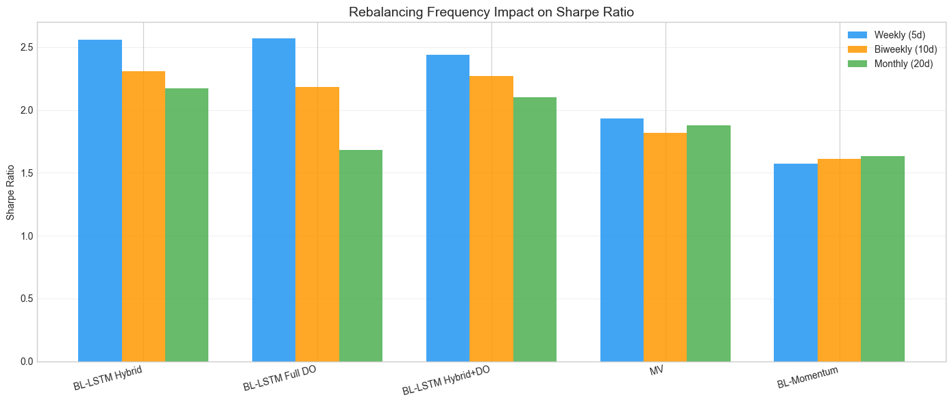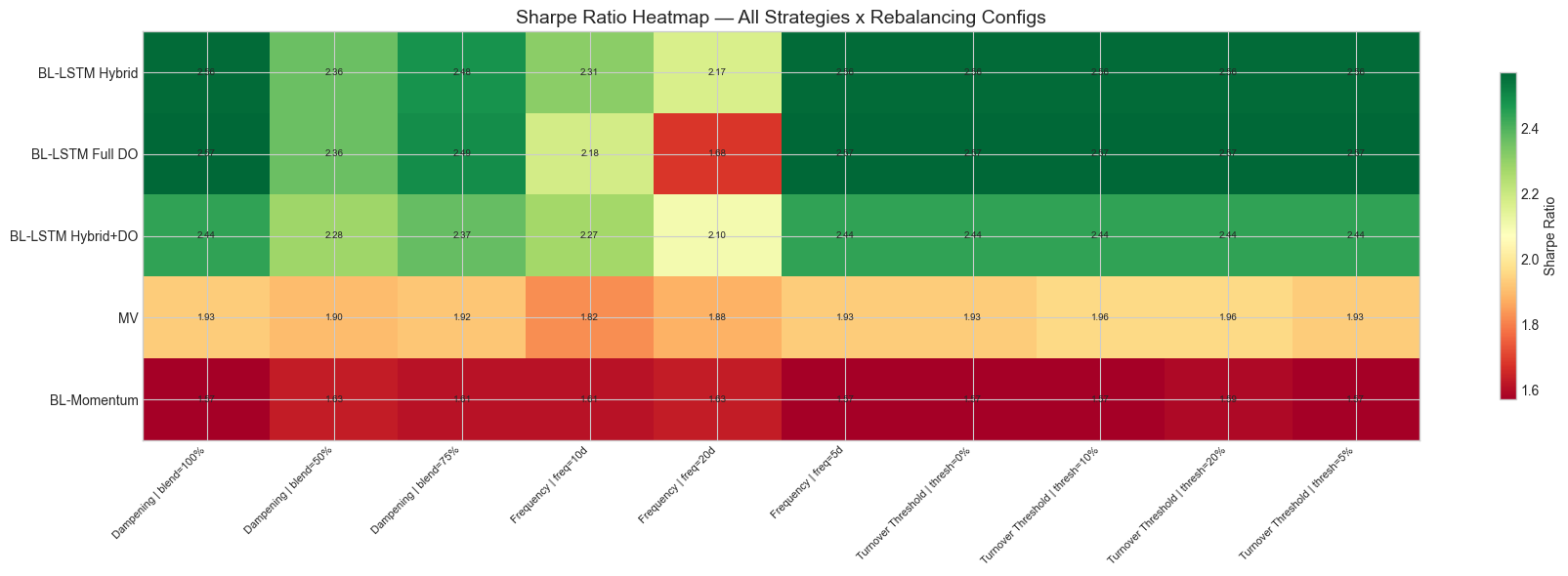 Scale of models trained: 6,396 models with ~50% average accuracy suggests the individual models have limited predictive power. The strategy's edge may be more attributable to the portfolio construction framework (selective BL + MV fallback) than to the LSTM predictions themselves.